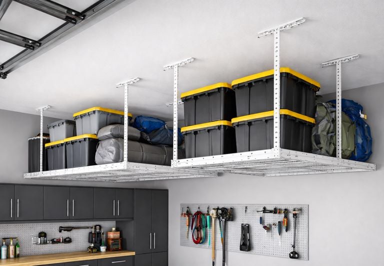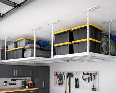 Lift bulky items off the floor with strong overhead storage solutions.